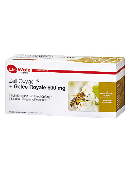 Zell Oxygen® + Gelee Royale 600 enthält neben den Enzym-Hefezellen Dr. Wolz® von Zell Oxygen® das biologisch hochaktive, frische Gelee Royale mit Enzymen, Vitaminen und Eiweißverbindungen. Dies ergibt eine optimale natürliche Wirkstoffkombination mit allen Vitalstoffen. 1 Trinkfläschchen enthält 600 mg frisches Gelee Royale und ist unsere empfohlene Tagesdosis. Die Wirkung von Gelee Royale auf die Königinnenlarve grenzt beinahe an ein Wunder. Die Königin wird ihr ganzes Leben lang mit Gelee Royale gefüttert und wird so 4-5 Jahre alt und legt täglich 2000 Eier. Eine Arbeitsbiene hingegen lebt nur 45 Tage. Deshalb ist die Bienenkönigin zum Symbol von Lebenskraft und Vitalität geworden. Das letzte Geheimnis von Gelee Royale ist noch immer nicht gelüftet. In Verbindung mit Zell Oxygen® Enzym-Hefezellen werden dem Körper sämtliche Vitalstoffe für ein biologisches Gleichgewicht zugeführt. Der bekannte TV-Gesundheitsexperte Prof. Bankhofer bestätigt in seiner TV-Sendung die faszinierende Kraft von Enzym-Hefezellen und Gelee Royal. Sie haben aktivierenden Einfluss auf unser Immunsystem, auf den Zellschutz, auf den Zellstoffwechsel und auf die Mitochondrien, das sind die Mini-Kraftwerke, die sich in jeder unserer Körperzellen befindet. Diese Kombination ist hilfreich zur Wiederherstellung Ihrer körperlichen Kräfte nach Krankheit, Erschöpfung und Müdigkeit und ist deshalb bei Sportlern besonders beliebt. Zell Oxygen® + Gelee Royale 600 stärkt die Abwehrkräfte und verbessert Ihr Wohlbefinden und die Leistungsfähigkeit, gerade bei älteren Menschen sehr zu Empfehlen. Es aktiviert die Körperkräfte und kann je nach Bedarf kurmäßig oder sogar im Dauergebrauch angewendet werden!