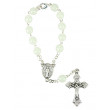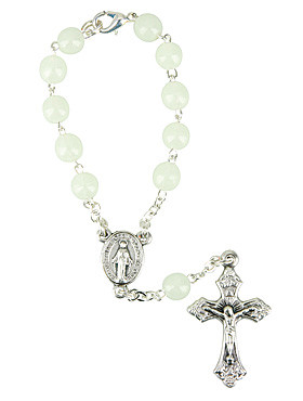 Die zehn Perlen dieses Rosenkranzes haben eine Besonderheit, die sich erst im Dunkeln zeigt: dann leuchten sie nämlich! Das Medaillon wurde wie die Wundertätige Medaille gestaltet. Mit silberner Schließe z. B. für den Autorückspiegel.