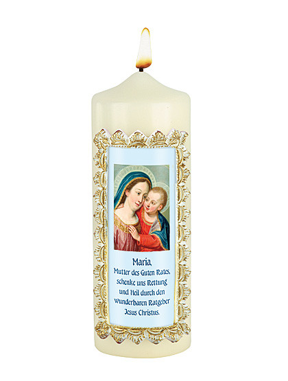 „Maria vom guten Rat-Kerze“, 7 x 20 cm, Handarbeit. Den Festtag „Maria vom guten Rat“ begehen wir am 26. April.
