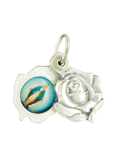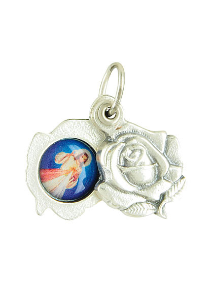 Zierliches silbernes Rosenmotiv-Medaillon das man auseinander klappen kann mit dem Barmherzigen Jesus und der Mutter Gottes. Eignet sich sehr als Geschenk für einen lieben Menschen. Mit Öse für die Halskette. Ø ca. 1,6 cm