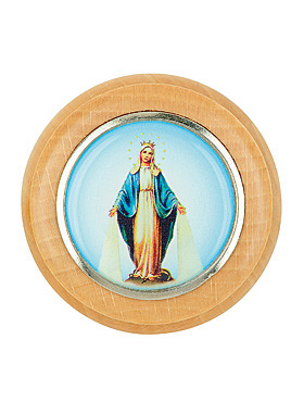 Ein guter Platz für den eigenen Lieblingsrosenkranz oder ein nettes kleines Geschenk ist dieses Holzdöschen, deren Deckel mit einer farbigen Darstellung Mariens nach der Wundertätigen Medaille verziert ist. Ø 4,5 cm