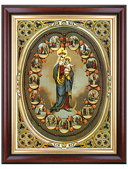 Rosenkranzbetrachtungen-Bild, 37 x 47 cm, Glückseliger Rosenkranz, der uns die Erkenntnis Jesu Christi vermittelt, indem er uns anleitet, das Leben, das Leiden, den Tod und die Glorie Jesu Christi zu betrachten. Dazu verhilft dieses einzigartige Bildnis mit seinen herrlichen Darstellungen der Glaubensgeheimnisse. Wird in einen Echtholzrahmen mit Goldkante geliefert. Dieser einzigartige Kunstdruck (30 x 40 cm), der sich für das betrachtende Beten sehr gut eignet und deshalb ein wunderbares Geschenk ist, ist auch ohne Holzrahmen um € 9,90 erhältlich. - Kundenmeinung