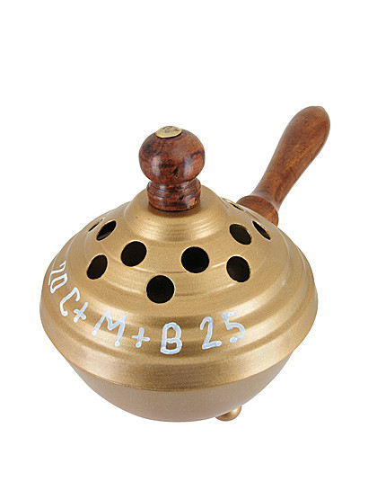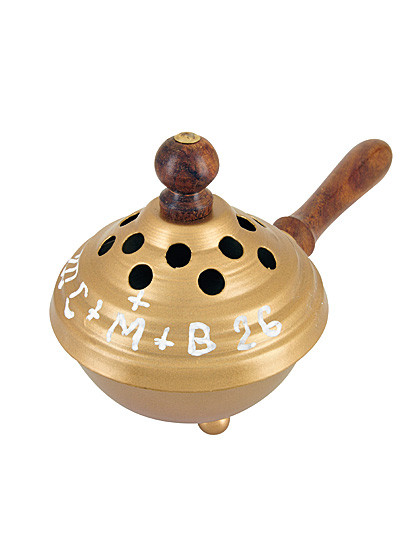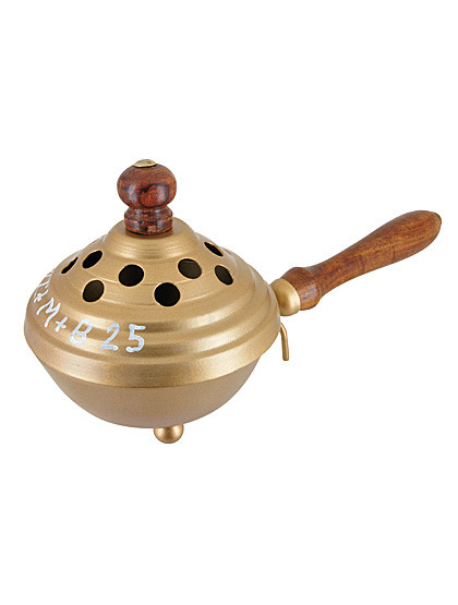 Die orientalisch anmutende Räucherpfanne, deren Gestaltung aus Jesus Zeit stammen könnte, ist aus Metall mit Holzgriff und dem traditionellen Schriftzug „20 C+M+B 26“ von Hand bemalt. Die 3 Weisen aus dem Morgenland brachten dem Göttlichen Kind bekanntlich Gold, Myrrhe und Weihrauch. L: 23 cm, H: 10 cm.