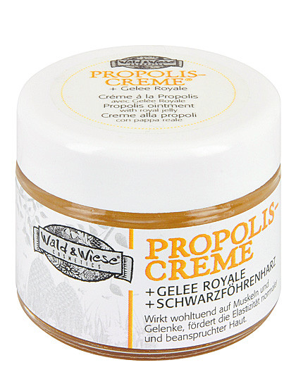 Unsere Propolis-Creme mit Gelee Royal und Schwarzföhrenharz ist von bester Qualität. Propolis wirkt als natürliches Antibiotikum entzündungshemmend, Schwarzföhrenharz verstärkt die Durchblutung des Gewebes und der Vitalkomplex von Gelee Royal versorgt die Haut mit wichtigen Nährstoffen. Daher eignet sich die Creme bestens bei Muskelquetschungen, Verstauchungen, Zerrungen, Ischias und Rheuma.