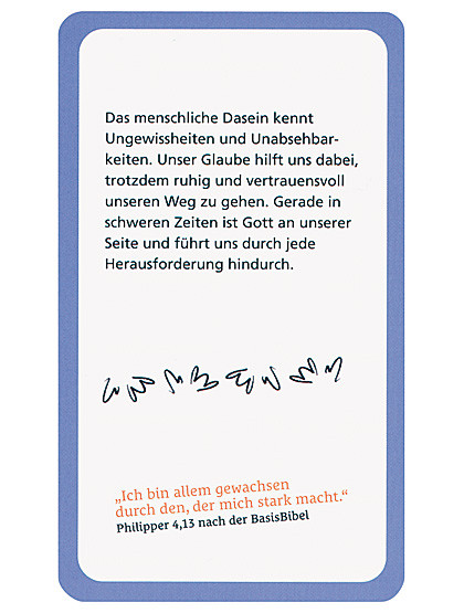 48 christliche Motivationskarten zum Thema "Glaube", mit einen Bibelzitat oder einem Gleichnis Jesu für viele verschiedene Alltagssituationen finden Sie auf der Rückseite.