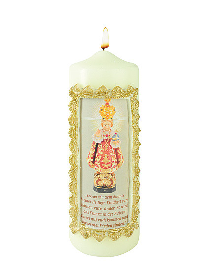 Die Prager Jesukind-Kerze ist mit einem Versprechen des Jesuskindes versehen und mit einem barocken Wachsrahmen verziert. Lange Brenndauer, 7 x 20 cm.