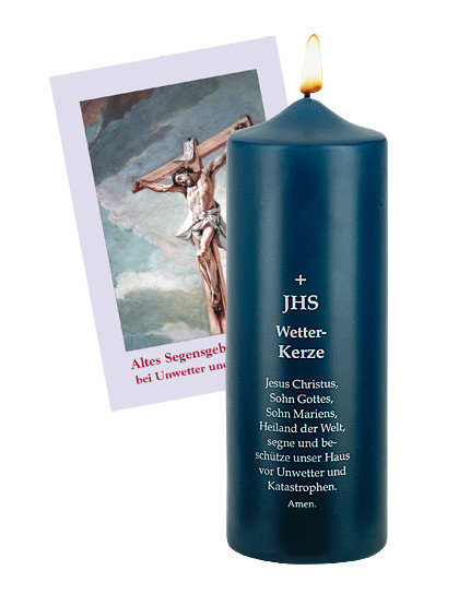 Entzünden wir die Wetterkerze und vertrauen wir im Gebet auf Gottes reichsten Segen und Schutz vor Unwetter und Katastrophen. Möge der Herr uns alles schenken, was wir zum Leben brauchen. Aus besten Qualitätswachs, mit besonders langer Brenndauer, in 7 x 20 cm und Segensgebet um Hilfe und Schutz.