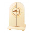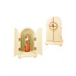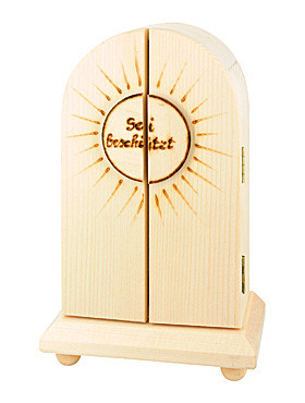 Für Andachten in den eigenen vier Wänden oder für kleinere Zusammenkünfte ist dieser zweiflügelige Hausaltar wie gemacht! Aus Holz von Hand gefertigt und in Einbrenntechnik verziert mit dem Spruch „Sei behütet“, birgt er im Inneren eine zierlich gefertigte wunderschöne Marienstatue aus gebrannten Ton, die liebevoll das Jesukind auf den Armen trägt. Ein wirklich selten-schönes Ensemble – für sich selbst oder einen lieben Menschen! Ehret die Mutter des Herrn! Maria bringt uns Schutz und Segen.