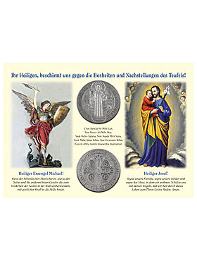 Als weitere Schutzpatrone sind dem Bannspruch der Anführer der himmlischen Heerscharen, der Erzengel Michael und der Nährvater unseres Herrn Jesus, der Heilige Josef, beigestellt. Während ersterer wie seit ehedem allem Bösen zu wehren weiß, ruht die liebevoll sorgende Hand des zweiten segnend auf allem, was dem Schutzsuchenden lieb und wert ist. Mit Metallöse zum Aufhängen und wichtigen Informationen auf der Rückseite. 30 x 21 cm