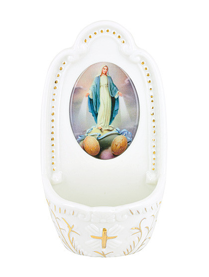 Ein Marien-Weihwasserbehälter aus glasiertem Porzellan. Ein klassisches Motiv, seit Jahrhunderten beliebt. Religiös verziert passt er in jede Wohnung. Größe 13 x 7,5 cm.