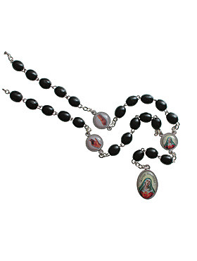 Fünf -Wunden-Rosenkranz aus leicht ovalen schwarzen Holzperlen. Dieser gekettelte Rosenkranz hat anstelle eines Kreuzes eine metallgerahmte Medaille, die auf der einen Seite das Motiv der schmerzhaften Gottesmutter Maria zeigt, Mater Dolorosa, und auf der anderen Seite das mit der Dornenkrone umkränzte Herz Jesu. Statt einer einzelnen Zwischenperle ist eine Medaille mit den Motiven der fünf Wunden Jesu eingearbeitet. Die Länge dieses Rosenkranzes beträgt ca. 30 cm, der Perlendurchmesser beträgt ca. 7 mm. - Kundenmeinung