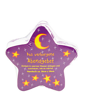 Dieser Stern birgt einige besondere Geheimnisse: in warmes Wasser gelegt, scheint er zu wachsen. Wenn er sich entfaltet, enthüllt sich zudem ein verborgenes Abendgebet – ein nettes Geschenk nicht nur für Kinder! Handtuch aus Baumwolle, ca. 30x30 cm