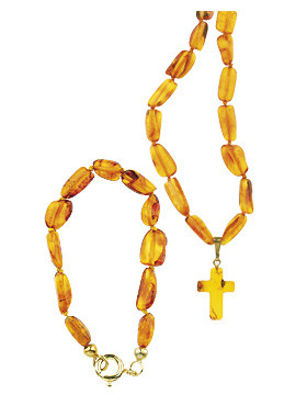 Das Bernstein-Taufset ist ein schöner Willkommensgruß für das Neugeborene. Es besteht aus einem Kettchen mit Kreuz und einem Armband, beides aus edlem goldfarbenem Bernstein. Es ist althergebrachte Tradition und Glaube das sich damit das Baby beim Zahnen leichter tut. Im praktischen Geschenkkarton – eine besondere Überraschung! 32 cm lange Kette mit Kreuz und ein 11 cm langes Armband. - Kundenmeinung