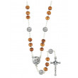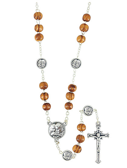 Dieser Hl. Josef-Rosenkranz ist aus runden Olivenholzperlen gefertigt und zeigt auf den Medaillen das Jesuskind auf den Armen des Hl. Josef. Länge: 33 cm