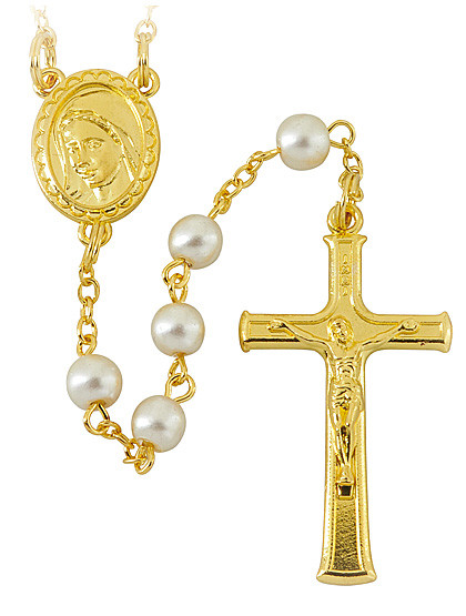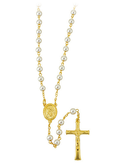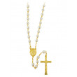 Dieser hochwertige Marienrosenkranz wurde von Hand goldfarben gekettelt und auf dem Zwischenstück ist das Antlitz Mariens fein geprägt! 5 x 10 weiße Perlen, Länge: 49 cm.