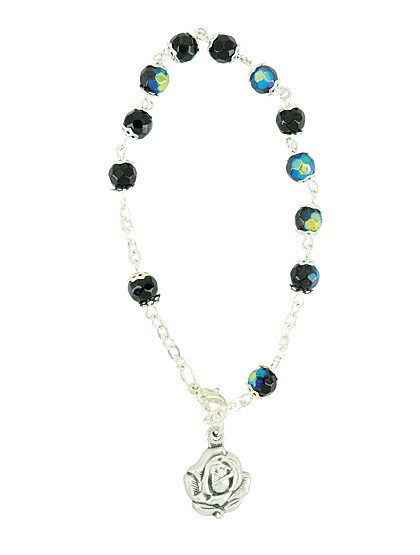 Dieses Muttergottes-Armband mit seinen facettierten Perlen, die je nach Lichteinfall in allen Farben schillern, ist eine echte Seltenheit. Es kann auch als 10er Rosenkranz verwendet werden und das Rosenmedaillon birgt auf der Rückseite die Jungfrau Maria.