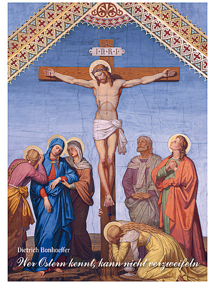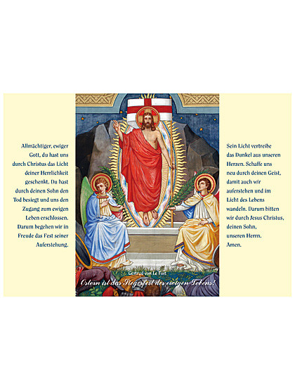 Das aufklappbare Osterbillett zeigt außen den Gekreuzigten und aufgeklappt den auferstandenen Christus, flankiert von einem Ostergebet. A5 auf A6 gefaltet, wird mit Kuvert geliefert.