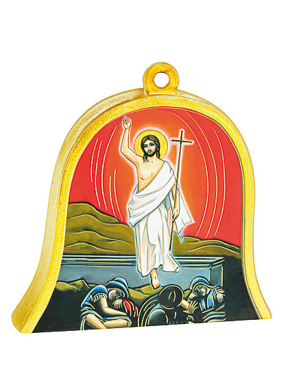 Eine bunte, farbenprächtig illustrierte Osterglocke aus Holz, die die Auferstehung des Heilands aus seinem Grab zeigt. Mit einem Loch zum Aufhängen. Schenken auch Sie ihr einen Platz in Ihrem Heim. Größe 10 x 10 cm. - Kundenmeinung