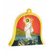 Eine bunte, farbenprächtig illustrierte Osterglocke aus Holz, die die Auferstehung des Heilands aus seinem Grab zeigt. Mit einem Loch zum Aufhängen. Größe 10 x 10 cm.