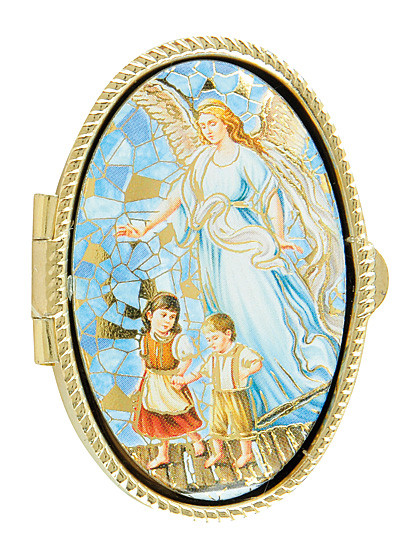 „Schutzengel-Metalldöschen“ mit einem praktischen Klappverschluss zeigt den Schutzengel der Kinder in einer strahlenden Darstellung. Größe: 3,5 x 5 cm.