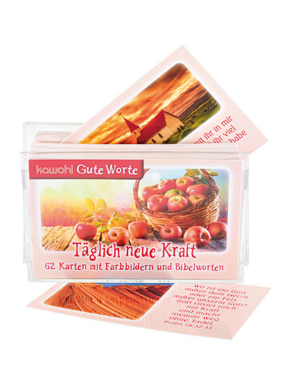 „Täglich neue Kraft-Kärtchen“ Gott spricht zu uns durch Worte der Bibel. Hier finden wir Rat, Trost und Hilfe. Maße: 8,5 x 5,5 cm, 62 Karten.
